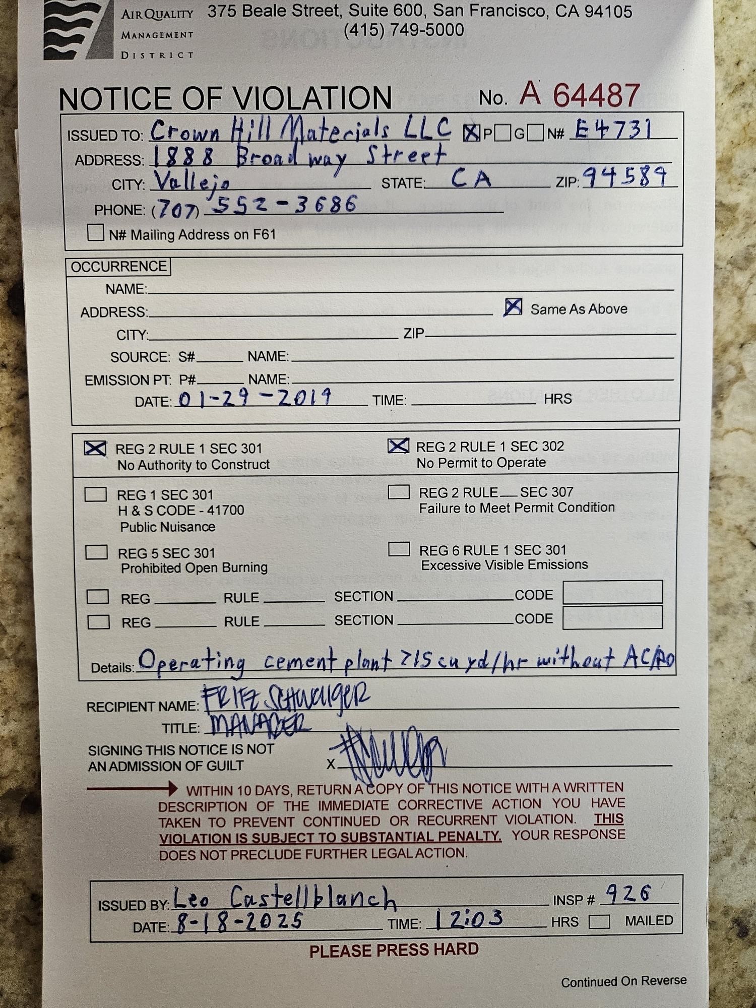 The Bay Area Air Quality Management District issued a notice of violation to Crown Hill Materials on Monday, giving the facility 10 days to provide written notice of any steps taken to comply with the law. The facility violates federal, state, and air district laws, according to the agency’s cease-and-desist letter. If the company fails to comply, BAAQMD said it will “take formal legal action” to shut down the equipment, according to a press release.